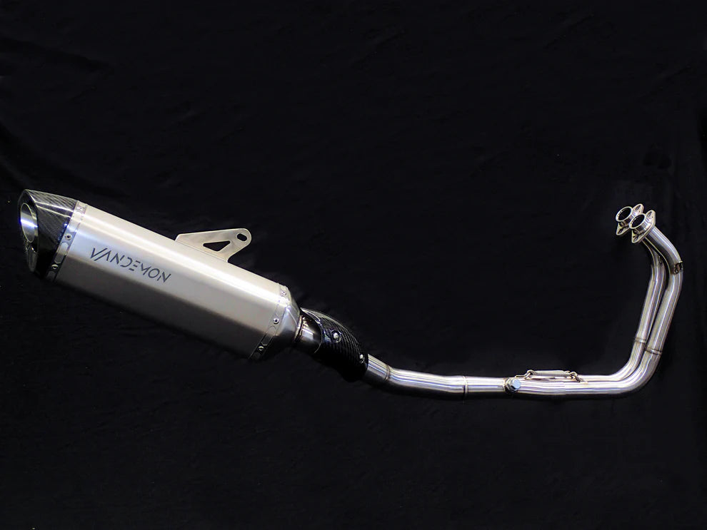 Kawasaki Ninja 400 all Stainless Steel headers utilising a carbon fibre-tipped all-titanium muffler. The complete system is much lighter than the OEM steel exhaust, and the resulting weight reduction noticeably improves directional handling changes and acceleration and reduces stopping distances. In addition, varying tapered mid-pipe tube dimensions make for a noticeable increase in Mid-Range torque and peak Hp and that unmistakable Vandemon sound.